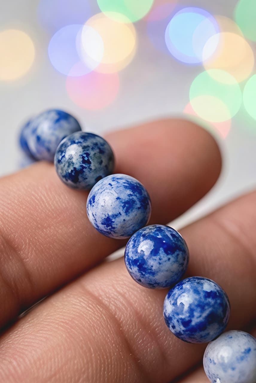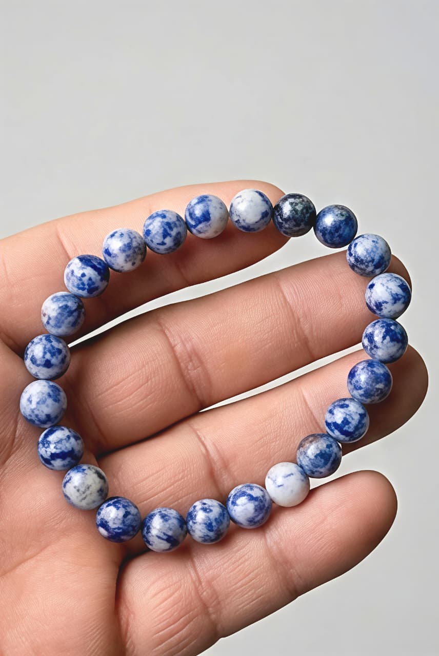 हे ब्रेसलेट नैसर्गिक सोडालाईट दगडांपासून तयार केलेले असून त्यामध्ये निळ्या रंगासोबत पांढऱ्या कॅल्साईटच्या सुंदर रेषा दिसतात. हे थ्रोट चक्र आणि थर्ड आय चक्र सक्रिय करण्यास मदत करते.